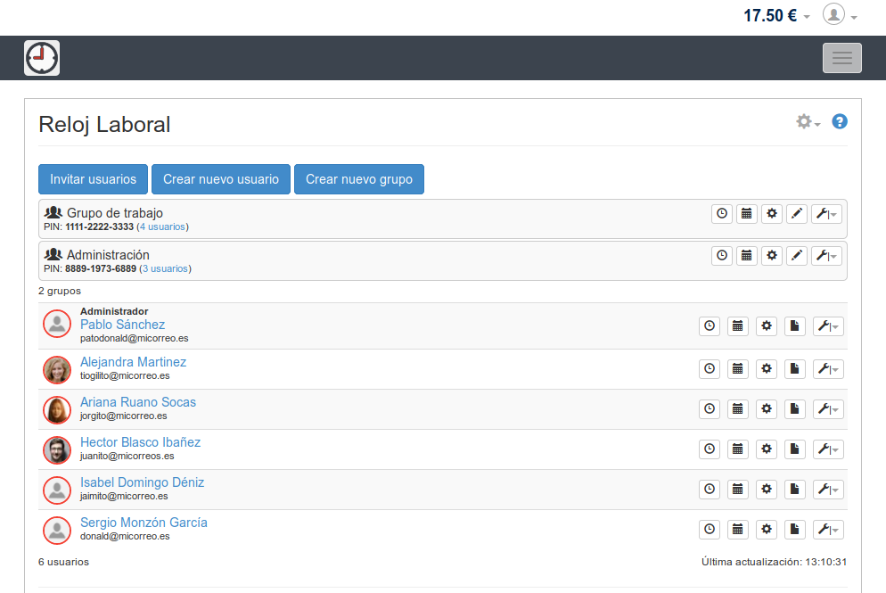 Para realizar el control de empleados podemos crear grupos, los cuales pueden acceder de forma grupal a la web de Reloj Laboral accediendo desde cualquier dispositivo conectado a Internet a través de un navegador web. Puede crear tantos grupos diferentes como desee, por departamentos, empleados, sedes, etc.